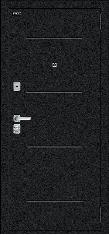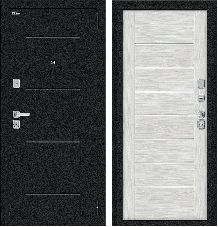 Надежная входная Дверь Браво Техно/BChrome Букле черное/Bianco Melinga премиум класса по цене 35 095 руб. Большая толщина стали защитит от проникновения в ваш дом, квартиру или коттедж. Используется очень качественная фурнитура: замки, цилиндры, ручки, защелки. Покрытие и отделка двери изготовлено под внимательным контролем производителя. Дверь имеет долгий срок службы и гарантию.